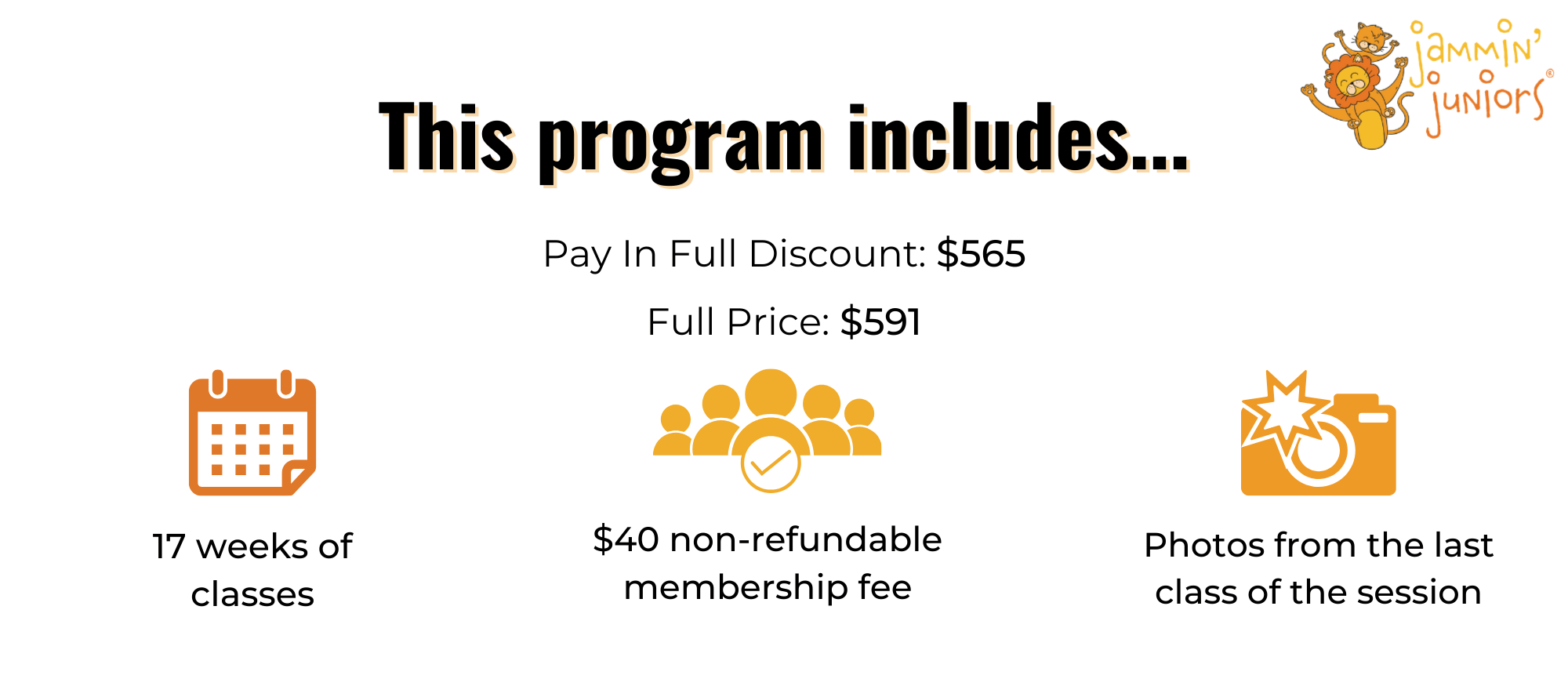 Jammin' Juniors® is a creative childhood development class for ages 6 months to 24 months. Each lesson offers a guided and supportive exploration into the world of movement and music. The classes encourage motor and social skills development, individual learning, and creative understanding for your little one. A Fall and Spring session is offered. Each session consists of 17 classes and requires 1 adult to participate. Come make lasting memories with your child!